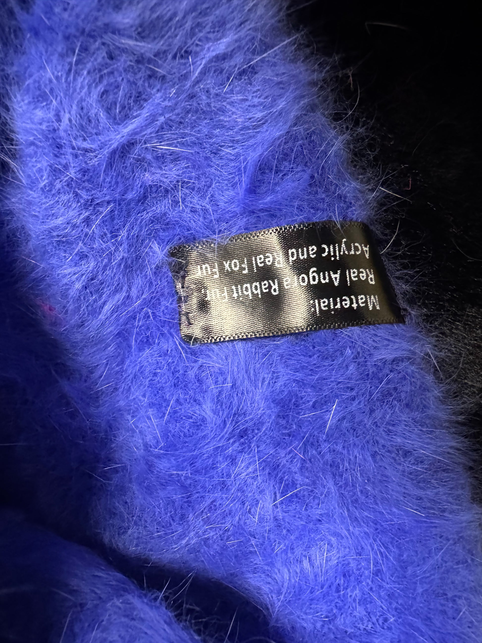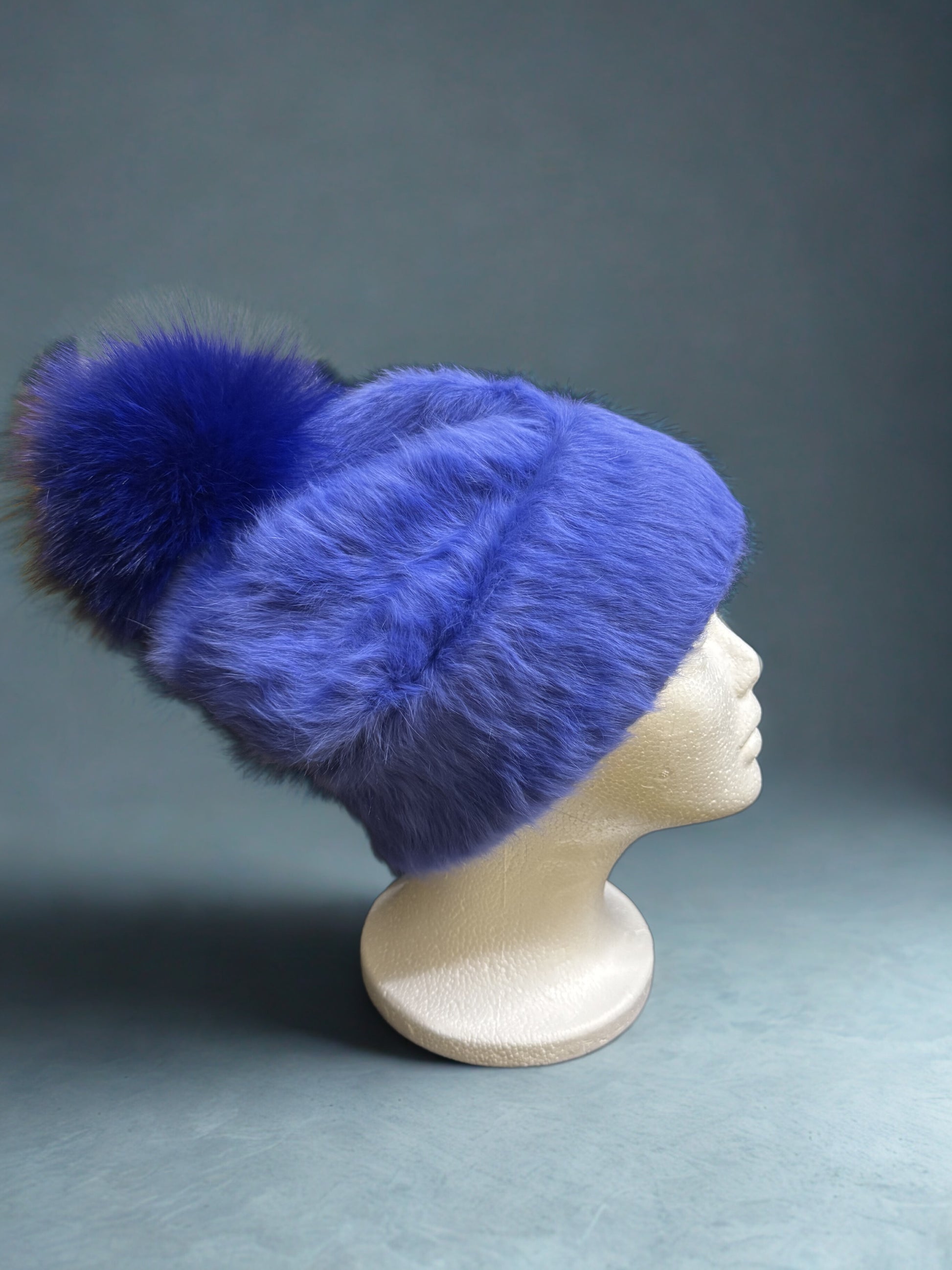 AVU LE VU Slouchy Beanie Hat Real Angora Rabbit Hair, Real Fox Pom Pom Blue